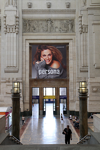 Milan station is an amazing relic of the Italy that Mussolini tried to build.  To step from the platforms into the concourse and booking hall is to step into the pre-war world of the fascists.  The architecture is very imperial, drawing heavily on ancient Rome but smoothed to ease the hardened edge of that society.   Even so, the area close to the platforms is crowded with passengers desperately watching for their train on the indicators.