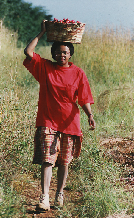 The Paprika crop is also harvested by hand – the ripe peppers are pulled from the bushes and returned to the farm compound where they are laid out on sheeting to dry. Here, my wife carries a basket in the traditional way back to the compound.