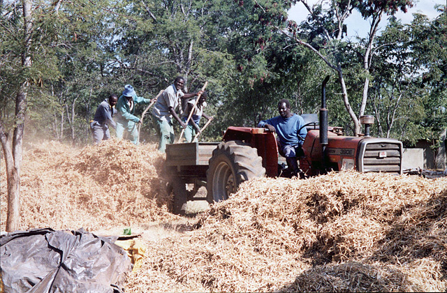 Here, the male workers including the foreman deliver a freshly harvested load of Sugarbeans to the farm compound for shelling. Off-loading with forks and brushes in a scene reminiscent of 1930’s Norfolk. Only the modern unkempt tractor hints at a more recent time.