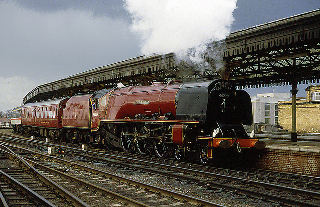 One of a class of 38 express passenger locomotives designed by Sir William Stanier for the London, Midland and Scottish Railway Company. She entered service in 1938 and was withdrawn in February 1964 during the rapid dieselisation of British Railways. Saved for posterity by Sir Billy Butlin she spent some years at Butlin’s Minehead holiday camp where children could play on her. In 1976 she was loaned to the National Railway Museum and was subsequently purchased by the museum in 1987. This photograph was taken in April 1985 when she operated the Yorkshire Coast Express. Recently she has been restored to her original streamlined guise, as she entered service in 1938 – Photo by Jon Benton available from the Railway Herald site.