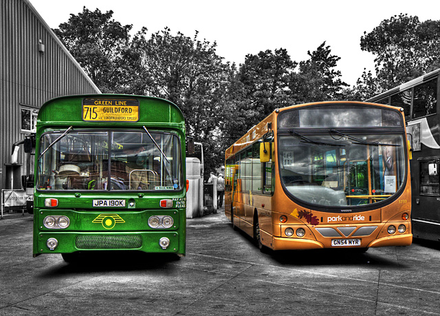 A 1970’s Greenline Coach stands beside a modern Arriva Southern Counties bus. The Greenline Coach is an AEC Reliance with Park Royal bodywork whilst the Arriva vehicle is a Volvo B7RLE with Wright Eclipse bodywork. Despite the 30 years difference in ages between the vehicles the Reliance still looks relatively modern. However, a ride on each vehicle soon demonstrates the changes in the intervening period. The Reliance has a harsh ride and the body flexes noticably. The seats are less well contoured for passenger comfort. There is no provision for disabled persons either with steep steps at the entrance and a high level floor above the mid-mounted engine. On the Volvo, the engine is mounted at the rear allowing a low floor. It can kneel at the front to make the step onto the platform easier for the elderly and the rear doors have a wheelchair ramp. So, those are some of the key changes to buses over the last 30 years in the UK. Of course (from an enthusiast’s point of view) the modern bus does lack a quality sound system… Nothing beats the ear-splitting roar of an AEC AH691 engine at full chat 😉
