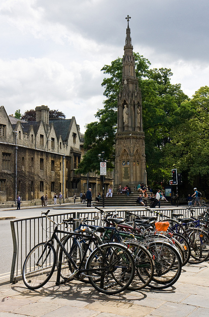 The city centre is a bustling place and, in keeping with the numerous cash strapped students, has thousands of bicycles all over the place. In the view below we see lots of them parked up on the corner opposite The Martyrs’ Memorial. This ‘cross’ is a memorial to the Oxford Martyrs – Hugh Latimer, Nicholas Ridley and Thomas Cranmer, who were tried for Heresy in 1555 and subsequently burned at the stake. The memorial was designed by George Gilbert Scott in 1838 and was completed in 1843. The statues of the three martyrs are by Henry Weekes.