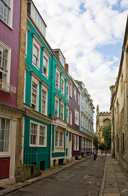 An O within an O – Oriel Street, with its houses painted in pastel shades, leads down to Oriel Square and Oriel College from the High Street.