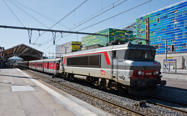 A riot of colour at the south end of Perpignan station with a Train à Grande Vitesse standing in front of the new Station buildings.
