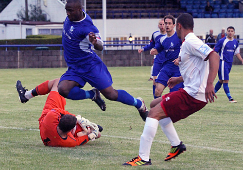 On an evening that saw the return of another two players that would normally be part of our first team, injuries permitting, Wingate and Finchley faced Chelmsford City in a friendly match. The returning players, Lairdy and Gaz, came home with sun tans that tell of the mediterranean, feta and olives. It won’t last – Lairdy will be white as a sheet (or should that be sheep) within a few weeks whilst Gaz will probably retain his extra shade a bit longer. Putting that aside, we again fielded a mix of first team regulars and youngsters on a pitch that was slippery as the evening saw periods of drizzle and occasional heavy rain.