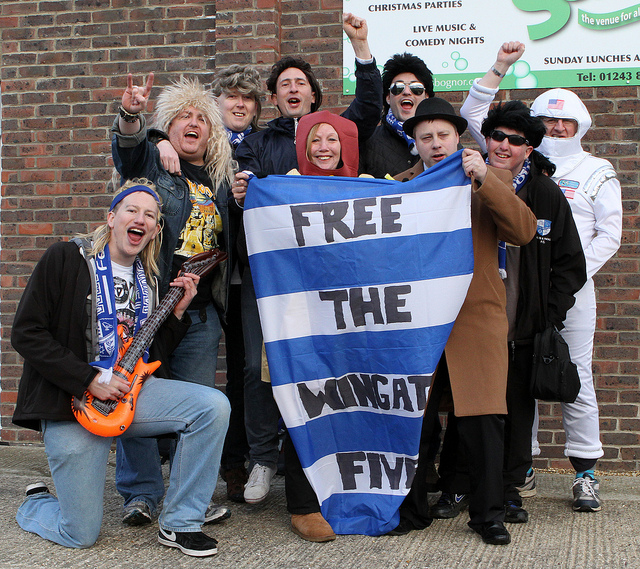 In a key match against Thurrock late in the season Wingate & Finchley had 5 players sent off resulting in the game being abandoned (see https://2e0mca.wordpress.com/2013/03/26/weekly-photo-challenge-future-tense/ for more info). At the next match in Bognor a selection of the fans turned up in fancy dress and spent the game singing “Free The Wingate Five”…