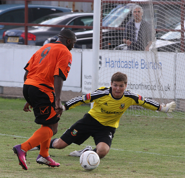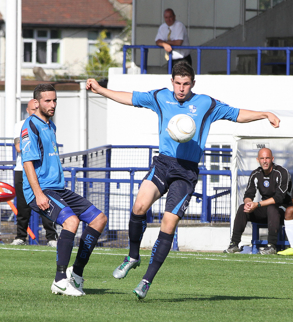 The Bank Holiday weekend saw, as usual, day-time games on Saturday and on Monday. The first against Kingstonian was played in rain that varied between persistent and go build an ark sayeth the lord proportions. It also saw Kingstonian demonstrate why many people have them pencilled in as favourites to get the automatic promotion spot at the end of the season – very well organised and very physical. Of course, it didn’t help that many of our players didn’t seem to have switched on that night and at least one – Hector – was forever slipping over! Wrong boot choice? I checked with him a couple of games later and can confirm wrong boots – moulded soles when proper studs would have been better. But choice – Hector didn’t have a choice. He only has the one set of boots 😦 Another example of the gap between higher leagues and the Ryman. Of the game, I can only say that Kingstonian deserved their victory but the referee contributed with a penalty decision that was expletive-deleted wrong. Weathers put in a perfectly good challenge to win the ball from the Kingstonian forward who then fell over his prostrate form. When challenged about the decision the referee said that he’d given the penalty for intent! Wow… wonderful decision… So lets have a penalty everytime a keeper comes out to punch a ball and any players head that happens to get in the way shall we? That’s real intent – absolutely ridiculous excuse for giving a wrong decision resulting in a potentially game changing goal.