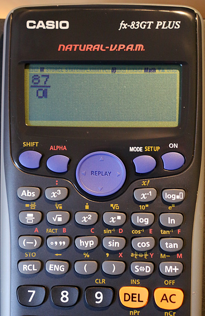 Now why, you may ask, is he showing a calculator? Have a look at the sum I’ve typed in – 87/0. I’m sure we all know what’ll happen when I hit the ‘=’ button. That’s right – Math Error! In elementary mathematics the result of division by zero is viewed as undefined. In certain areas of mathematics however – notably algebra and applied mathematics you’re likely to come across equations where as the value of one component grows smaller, the resultant becomes ever larger and is said to approach infinity – the classic example is y=1/x. Effectively – as x approaches zero, y approaches an infinitely large value. Logically then, Zero goes into any number an Infinite number of times – and the poor old calculator (along with the human brain) having no real way to comprehend that situation, throws a wobbly 😉