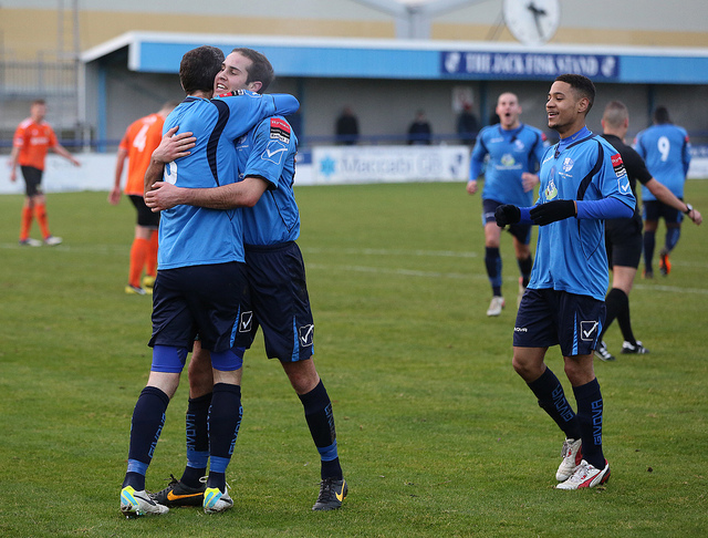 Adam Bolle hugs Dan McGonigle as he celebrates scoring on his debut for Wingate & Finchley FC.
