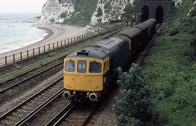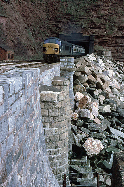 45017 exits Parson Tunnel – dwarfed by the sea defences in the foreground