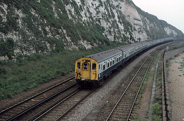 Aycliff, Dover – 411605 leads a 12-car Dover Priory to London Victoria service beneath the cliffs