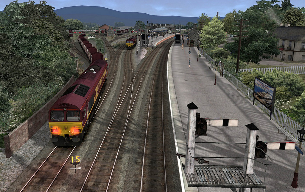Departing Newton Stewart we see the remains of the Whithorn and Garlieston branch on the left and the small shed that provided locomotives for the branch – The shed is still there to be seen on satelite maps, finding new life as premises for light industry. Passing under the Old Military Road (there are quite a few of these in Scotland) the crew find themselves suddenly facing a vicious 1 in 68 grade which eases after a short while to 1 in 86 as the line climbs to Glasnick. During the climb we pass through areas of forestry and some scenarios for the line remaining open see it used to carry timber – a trade that the modern day railway is involved with on remaining lines in other parts of Scotland. Breasting the summit the line then descends on an easier 1 in 100 grade before levelling to cross the River Bladnoch. The crossing point once occupied by the railway is now used by the re-aligned A75 although the original road and bridge still crosses the river further upstream. The line climbs briefly after the river on a gentle grade to reach Kirkcowan where the station is situated a little to the west of the town. There were permanent way sidings here and presumably some agricultural freight.