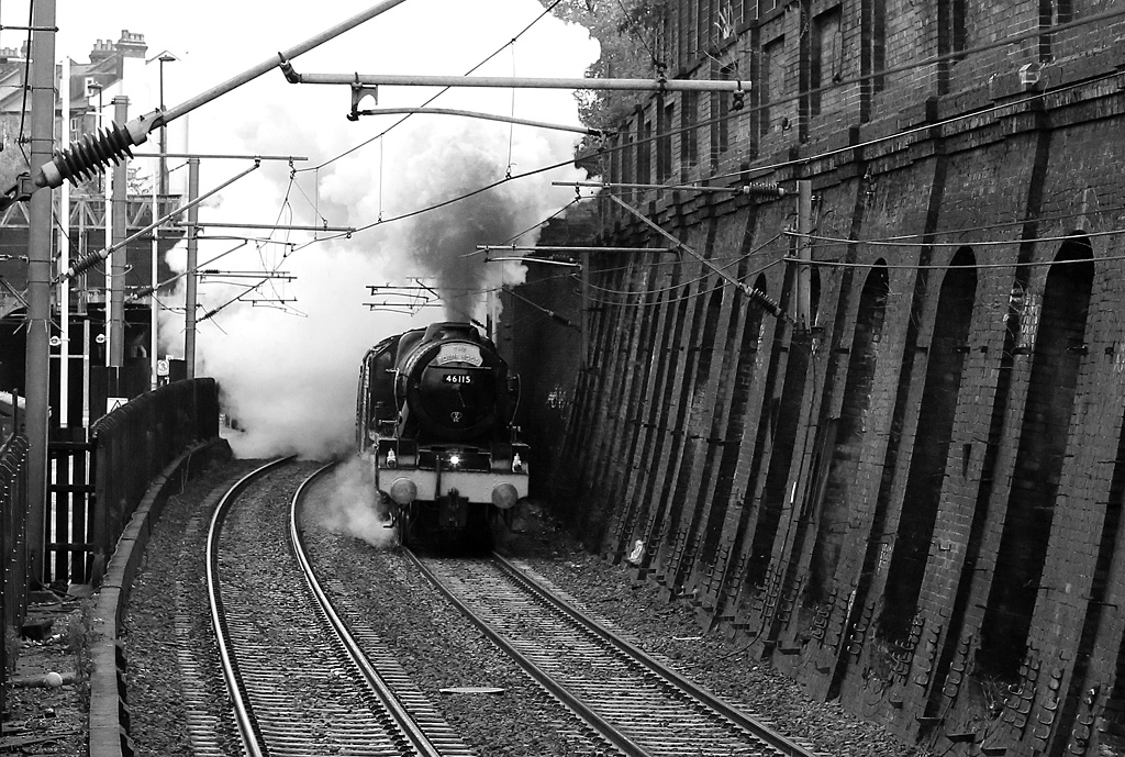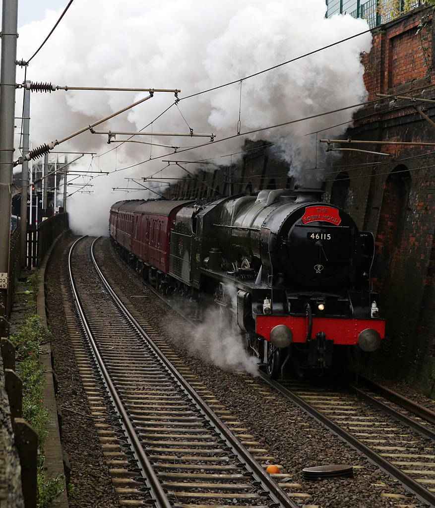 …So why was I at the Euston Remembrance Parade? Because Remembrance Sunday saw the first run of a steam locomotive out of the new St.Pancras Station and I felt that I should record the passage of the train through Kentish Town. I give you Royal Scot Class Locomotive 46115…