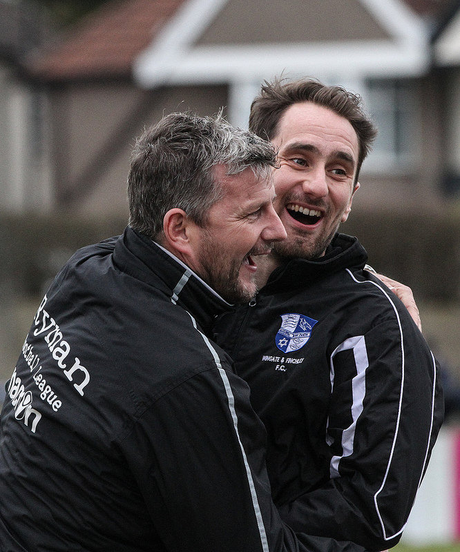 Thanks Sue – it was taken at our Wingate & Finchley Community Day when we played Dulwich Hamlet FC. Barnet Mencap had a football competition before the main match and there was a match between the fans of both clubs afterwards. The funds raised went to Noah’s Ark Hospice (noahsarkhospice.org.uk/). Dave and Danny are our Manager & Head Coach and they were celebrating us taking a two goal lead.