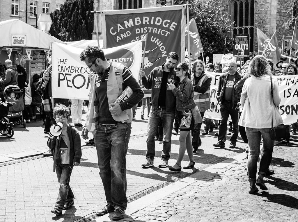 There is a nice postscript to this shot as well. I thought that people in the image might like a copy so I contacted the Cambridge & District TUC only to be responded to by the guy at the front of the march. He was over the moon that I’d taken the trouble to contact them. It’s a photo of him and his son and he’s going to print it and frame it! As a photographer I always love it when I can spread a little happiness 🙂