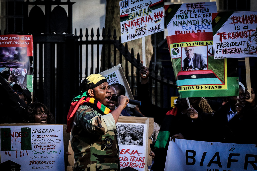 Biafra was a state that briefly seceded from Nigera during the Nigerian-Biafran war (1967-1970). Since then the wish to become a separate state has been bubbling away under the surface. Now it’s becoming a major political topic again. Nnamdi Kanu is based in the UK and runs a radio station called Radio Biafra which is pro-secession. He was arrested by Nigeria’s DSS at Lagos airport as he was returning to the country. The protesters clearly think that the Nigerian Government is in the British Government’s pocket…see https://www.flickr.com/photos/martin_addison/22414706284/ hence a protest opposite 10 Downing Street! That’s loosely the background but I’m sure there are some better qualified bloggers out there who can give the full story. See below for more info…