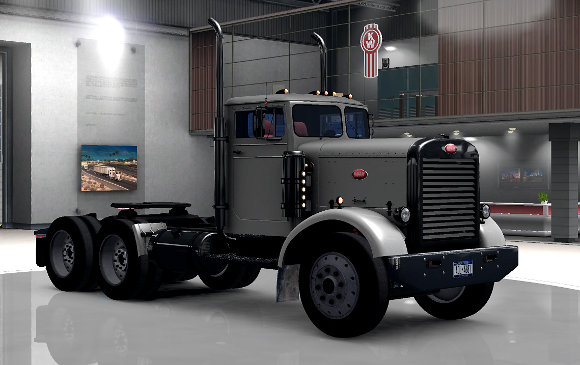 One issue that I have experienced with mods is the spawn rate – one that I loaded into American Truck literally took over all the AI trailers so that any truck out there was hauling an R3000 Reefer in one of the liveries the mod supplied. I disabled that one but will put it in again from time to time if I want to get a screenshot with one of the specific company’s trailers. Other issues include skin textures that don’t load correctly resulting in bright red trailers, sometimes displaying the word ‘texture’, running around in game 😦 Another, less important, issue is the mods that break the game economy. I prefer not to use ones that do that – I could already have a ‘389 but the mod sets the price at just over $50k which is unrealistic as it should probably be closer to the $120k cost of the Kenworth W900. I have recently added the Peterbilt 351 into ATS again. This is a very old truck and the asking price of around $45k probably isn’t economy breaking – I may indulge myself and buy one to drive as a change from ‘Rolled Gold’.