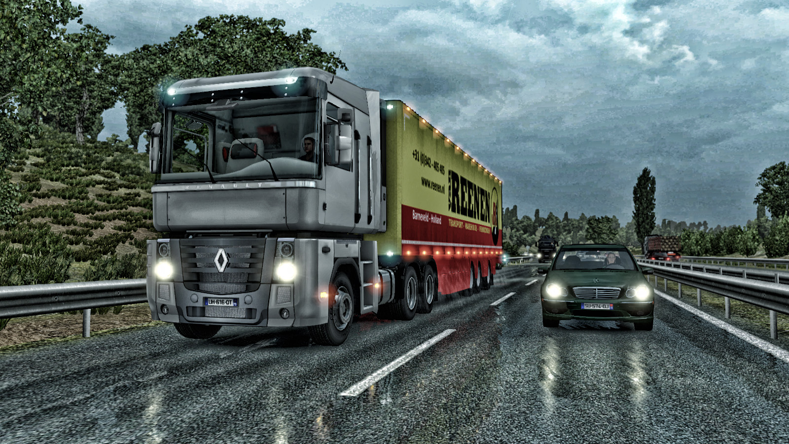 In Euro Truck I started afresh and I worked through the driver for hire period to the point where I could buy my own truck – but I wanted to buy a specific older truck second-hand and that actually meant driving as a hire for even longer… up to level 10. At which point I purchased my desired second-hand truck only to meet disappointment… See the next post 😉 In the meantime – a couple of screenshots from ETS.