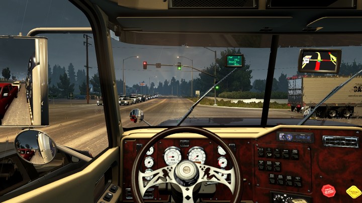 The handling of the truck is really nice with the steering feeling heavy when running slow without a load but lightening once there is some weight behind. The turning circle seems the same as the Peterbilt 389 which is probably about right. The mod provides a good selection of engines and given that from the inside the truck appears like an earlier build, I have fitted the 520hp version of the Cummins 444. This engine makes a wonderful racket thanks to sounds from Kapitan Kriechbaum :-) I did take a look on the web and found a couple of examples of International 9900’s fitted with Cummins engines of this type although the ISX is much more common. As usual for a truck below 600hp I’m using the 13sp Eaton Fuller box. Make no mistake, this mod is worth adding to your truck fleet because it is a really nice drive and it stands out from all those Kenworth’s and Peterbilt’s! Here are some screenshots…
