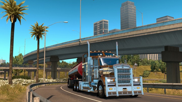 However, all was not quite right with my game. I was experiencing freezes of 2–3 seconds from time to time. I expect a slight frame-rate drop when there are a lot of textures or a lot of ai to render but not freezes like these. An investigation was in order. Advice in the community is to check the game log file (not the crash log) for errors. Sure enough, an investigation revealed a number of errors. One batch was for the mirrors on the International 9900 – I had noticed a tendency to glitch-out. There were a number of others which are apparently minor and I was able to confirm that they were not causing the freezing issue. As a test I sold my International and deleted the mod from the game. The errors disappeared but the freezing issue did not. Cue some head-scratching. Then I looked closely at the Warnings in the log. Finally I spotted one for Buffer Overflow. It seemed that whenever the game needed to load a specific trailer skin for an ai vehicle the buffer was too small for the size of the skin. Other skins by the same mod maker for this trailer did not have the same issue – I guess they forgot to resize the file? I disabled the particular skin and hey-presto! The freezing issue was gone. Below – Rolled Gold hauls the offending ‘Amoco’ tanker on the intersection of I5 and I10 in Los Angeles…