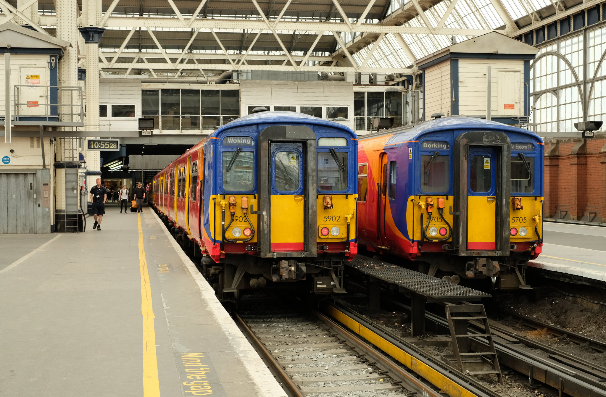 Class 455 units 5902 and 5705 wait under the train shed at Waterloo with services to Woking and Dorking.