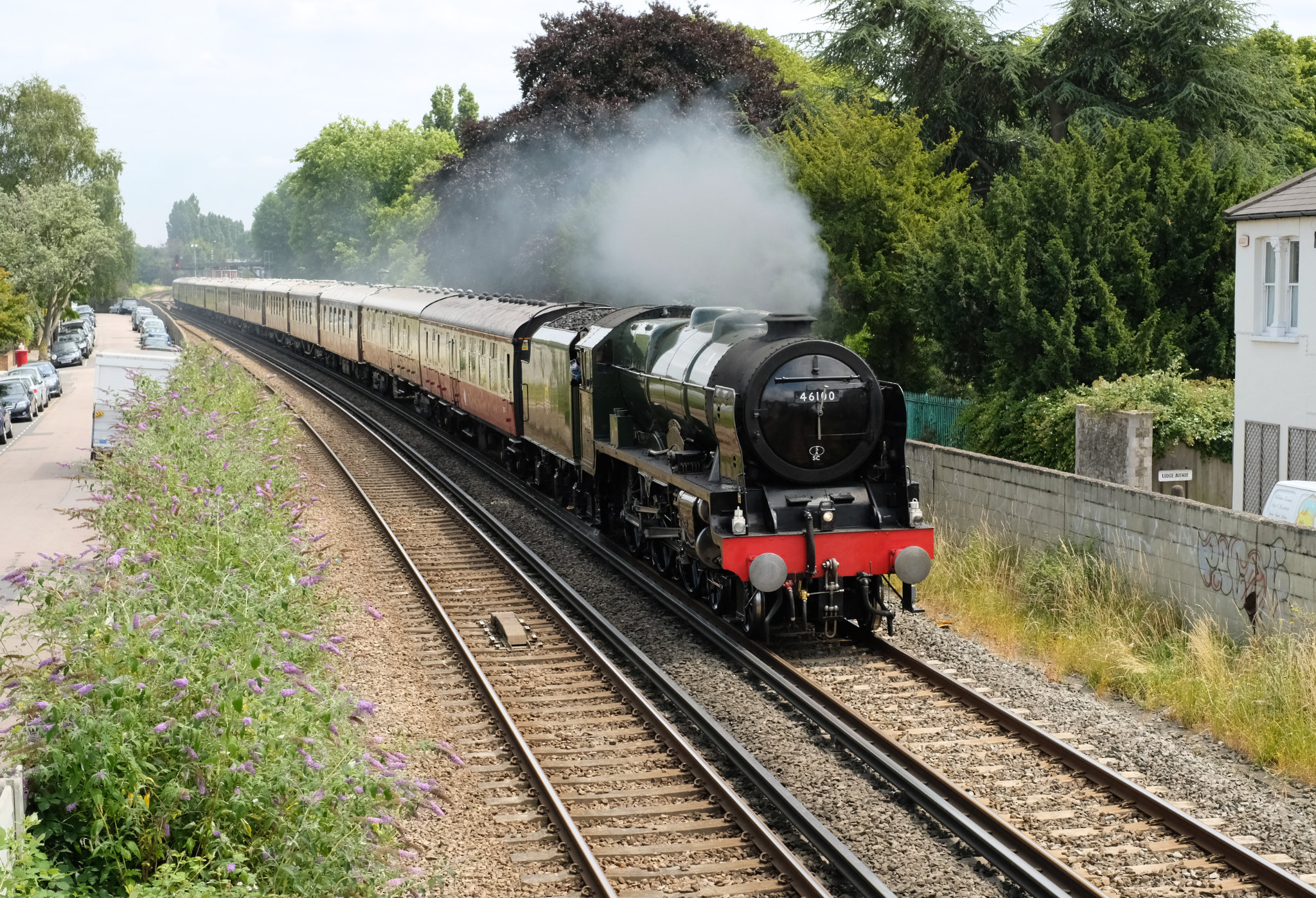 46100 ‘Royal Scot’ hauls the Belmond British Pullman through Mortlake on an overcast summer Saturday.