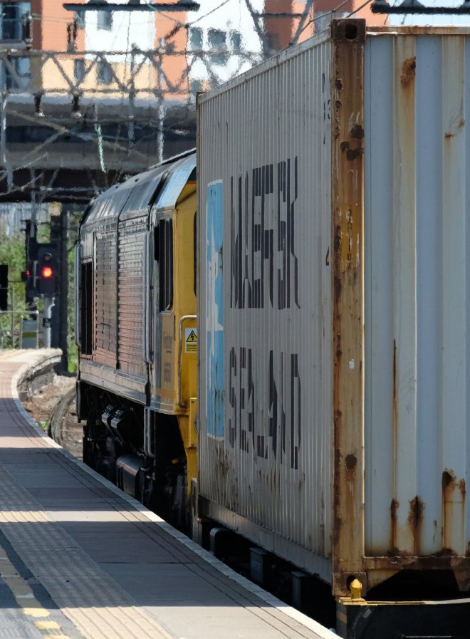 66560 crawls through platform 10a at Stratford with the 4L41 Crewe Basford Hall SSM – Felixstowe North FLT intermodal service.