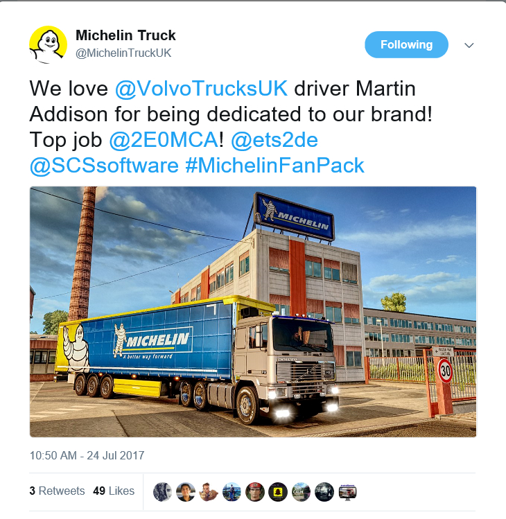 In the same week that Cee challenged us to come up with some B&W wheel shots, Michelin Truck UK were asking people to tweet their Euro-Truck Sim screenshots of trucks with Michelin tyres from the fan-pack. They seem to have liked my entry 😉