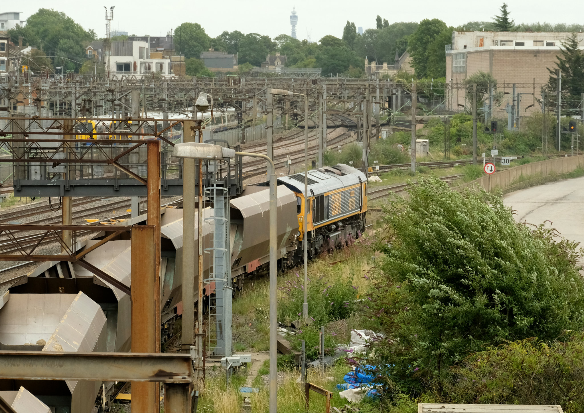After a wait in South West Sidings to allow another train to pass, 66719 takes the curve through Willesden Junction towards Mitre Bridge Junction with the 6O72 Colnbrook to Grain aggregates empties. The main line to Euston curves away to the left with the BT Tower on the horizon. The trains just visible through the catenary on the left are parked up in Willesden Traction Maintenance Depot. Another grey day in north-west London with the rain imminent.