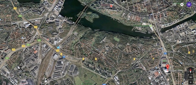 …And in the real world you can see where we are on google maps. The junction is on the left and I’ve pinpointed the Ericcson Globe…
