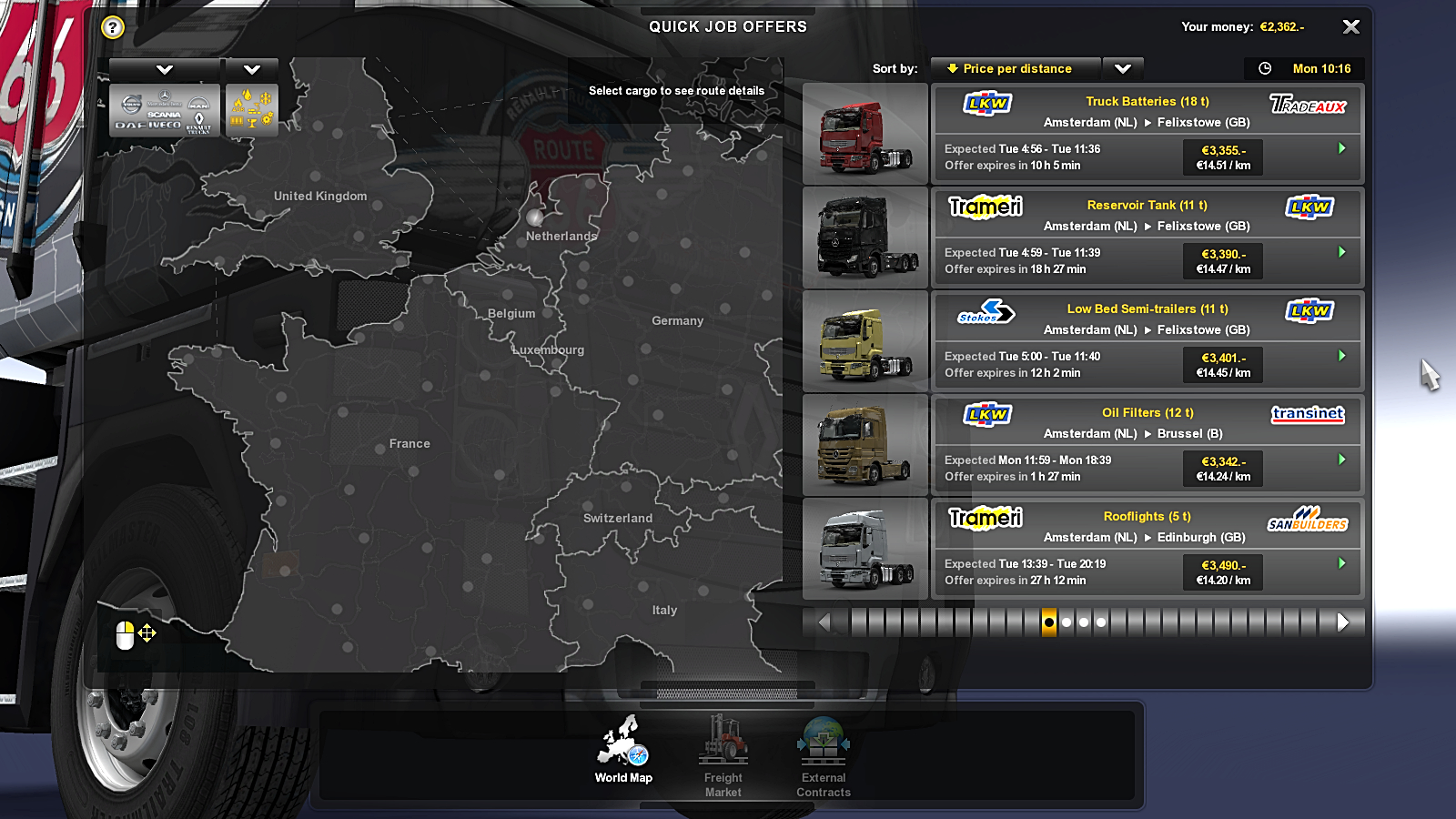 Another choice you will need to make is where to take each job from – the jobs market shows all available ‘quick jobs’. To get jobs in a specific location just click on the city on the map. From a realism point of view I will always take my next job from the last town I delivered to because I’m sure real life journeyman truckers wouldn’t travel to Nice to pick up their next job after dropping off a cargo in Berlin. But that’s something you will need to decide for yourself. This applies to the Quick Jobs and, once you have your own truck, Freight Market jobs so you need to be aware.
