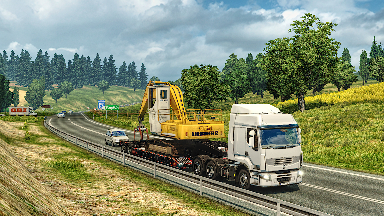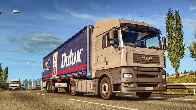 I’ve mentioned that this is a chance to learn about the different trucks and to Illustrate the point I started out in a MAN TGX then had a DAF XF for the run to Frankfurt – didn’t convince me that I should like DAF’s! The run to Düsseldorf produced another Volvo FH16 Classic but then the drive to Brussels gave the opportunity to try out a Mercedes Benz Actros. This run caused me a minor embarrassment as I overran a red light incurring a €160 fine. Brussels to Carlisle was a surprise as the truck provided was a MAN TGA – courtesy of MADSTER’s mod. That was a real pleasure – I’d forgotten how nice a truck the TGA is to drive (Now driving one in my main profile!). The Carlisle to Hannover run with the Renault Premium was fun too but for different reasons – had to have eyes in the back of my head at every junction and whenever there were roadside barriers. A trailer that needs watching and that’s all part of the fun 🙂 Here we go with a couple of images from these early runs…