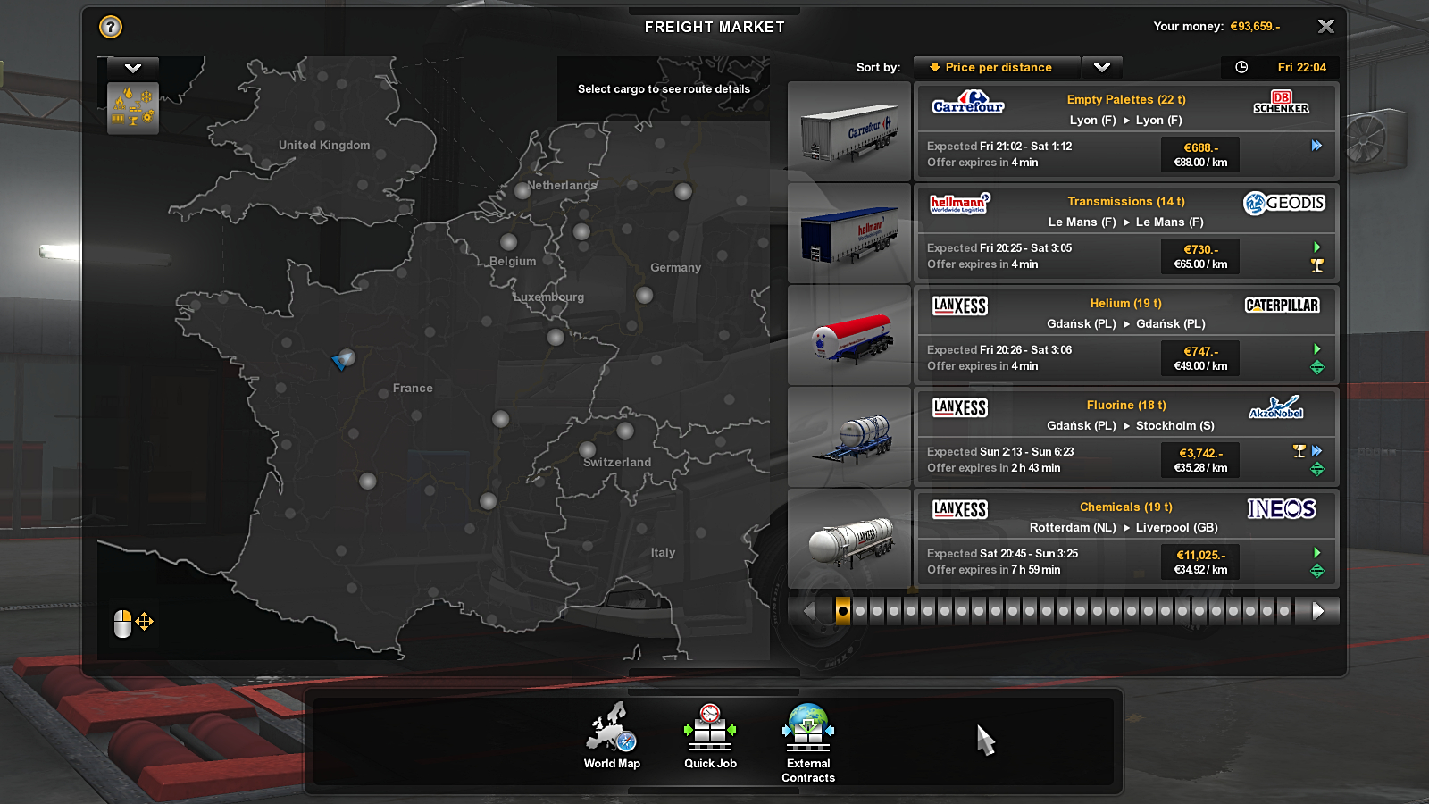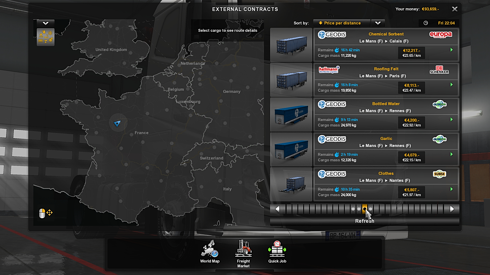 The jobs and the screens differ in a couple of ways. The Freight Market screen marks where your truck is but gives you the option of selecting a cargo from anywhere on the map so, for example I’m in Le Mans but I could choose to pick up a job from Gdansk! This may seem odd but there are circumstances where you might wish to take a specific cargo from a nearby city – probably because it counts towards an Achievement. Each job has an expiry time in minutes to hours. It’s important to recognise that this is game clock time not real world time. So if you were to pick one of the jobs in the screenshot with a 4 minute expiry, you will probably find it gone by the time you reach the pick-up point! The arrows on the right of each job are important too. They show the urgency of the task and are the only way to guess at how tight for time your run will be once you’ve hooked up to your trailer – that expected time on the left seems to relate to collection though only loosely. The Freight Market jobs only tell you when you actually need to be at your destination once you’ve hooked up – anyone smelling a trap here?! And, once again, this is game clock time – not the time on your watch. One positive in that is that the clock stops if you pause the game.