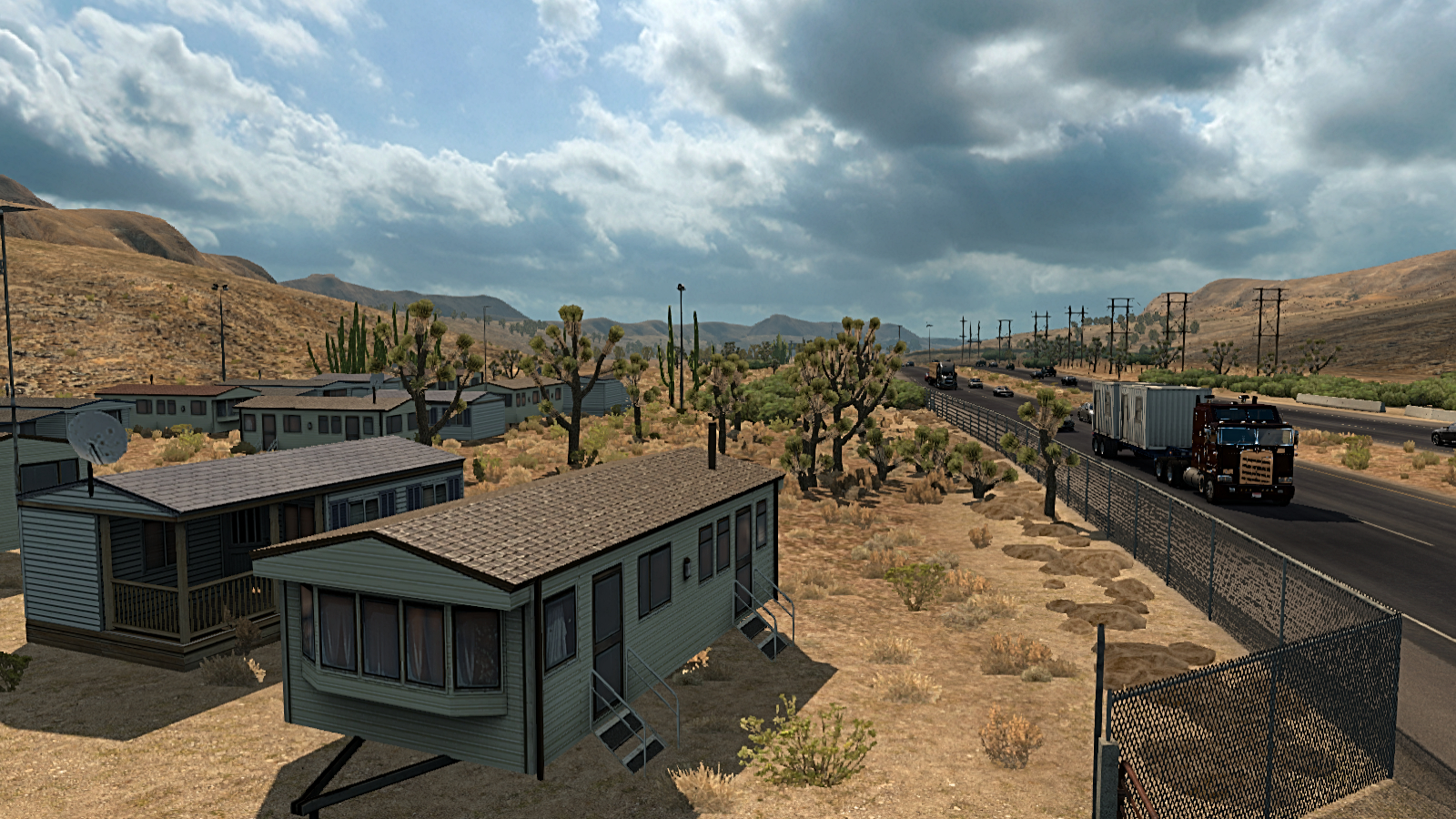 After the last job I parked up in a motel near Bakersfield rail depot for a good night’s sleep. In the morning I found a load of Construction Offices going to Flagstaff but to collect them I had to run light into Bakersfield itself. Then we were off along Route 58 passing a large trailer park along the way…