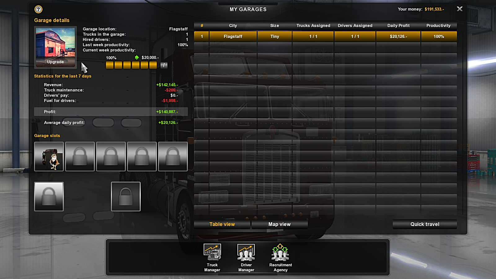 Upgrading your garage will cost 180K in Euros or Dollars – you do it by clicking on the upgrade button hiding in the image of the garage on the top left of the screen. What this will do is unlock two more garage slots allowing you to have another two vehicles based there. So where’s the dilemma? Well, if you choose instead to buy a new garage elsewhere instead of upgrading your existing one you get three slots at the new garage which still only costs you 180K. So you either have a total of three or four garage slots depending on which option you take. Many members of the community feel that getting that extra slot for the same money is always the way you should go. I think it depends on how realistic you are trying to play the game. Companies usually expand in their home area first before buying additional premises elsewhere, not least because of the logistical and communication complexities that multi-location operations introduce. So, in my own profiles I’ve always gone for the upgrade option and that is what we’re going to do in our Lone Star Project over at Flagstaff. But first we’ve got to drive there.