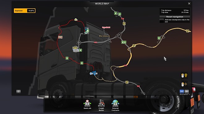 Our headquarters garage is in Lyon so I think we need a new garage in a different area of France. Lille or Reims might be a good choice being close to the northern border. However, I really fancy one of the cities along the Atlantic coast. In my main profile I have a garage in Nantes and it is one of my favourites for visiting (when available loads and time permit). Alternatives I considered back then were La Rochelle and Bordeaux. This time I think we’ll go with Bordeaux. So – decision taken I picked up a load of Schweppes beverages and off we went…