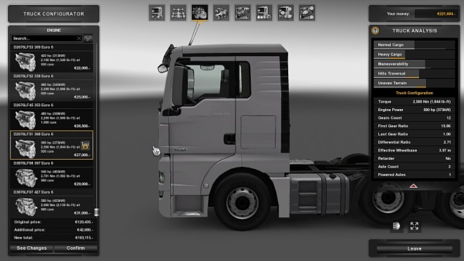 I planned to buy the latest Euro VI version of the MAN TGX. This is a Mod by Madster who is also responsible for my beloved MAN TGA. It’s available via the Steam Workshop which means it should be up to date. I worked through the truck configuration stages in the dealer, choosing a cab type then the 6×2/4 midlift chassis and moving on to the engine. This image gives you an idea of the screen and options available for the engines…