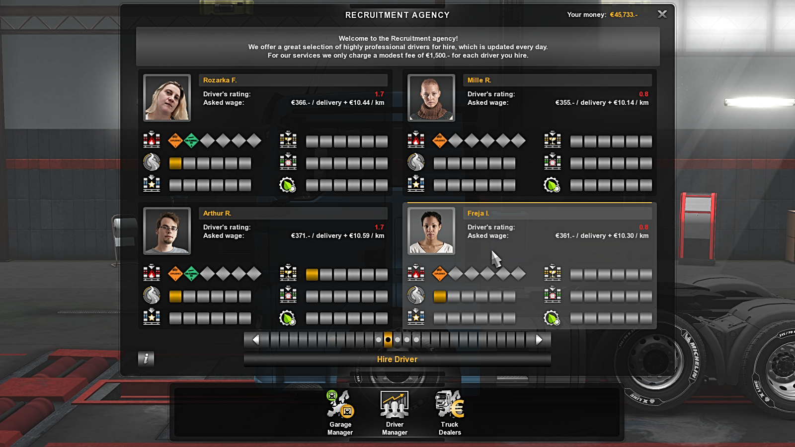 She will operate out of Bordeaux for us. You can specify what training a driver should do if you access them through the company screen but the default is balanced and unless you can remember to check all your drivers very regularly it’s best left on that setting. As the drivers skills increase so will the amount you pay them. Equally, the amount they earn the company goes up with their skills and pretty rapidly 🙂 An important point to note about your hired drivers – they are effectively home based drivers. After each outbound job they will look for a job going back to base – they don’t free roam like I do. Freja will always return to Bordeaux even if she can’t find a return job so sometimes she will cost me money but most of the time she will find something to haul and make a profit for the company.