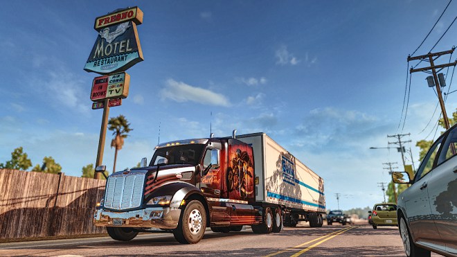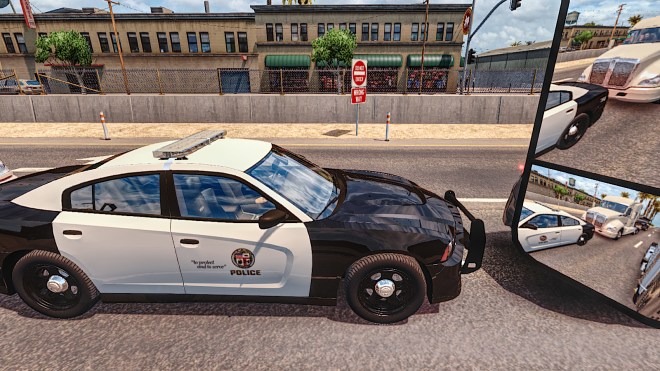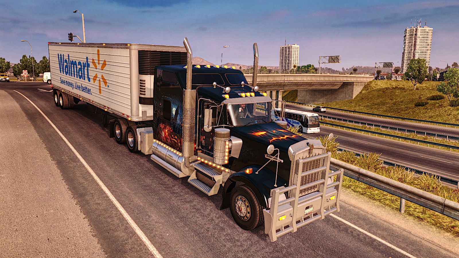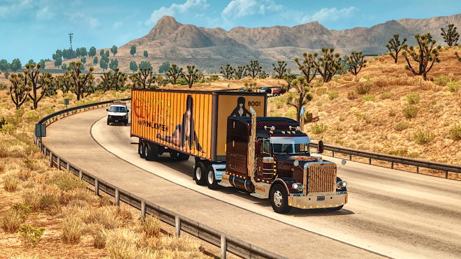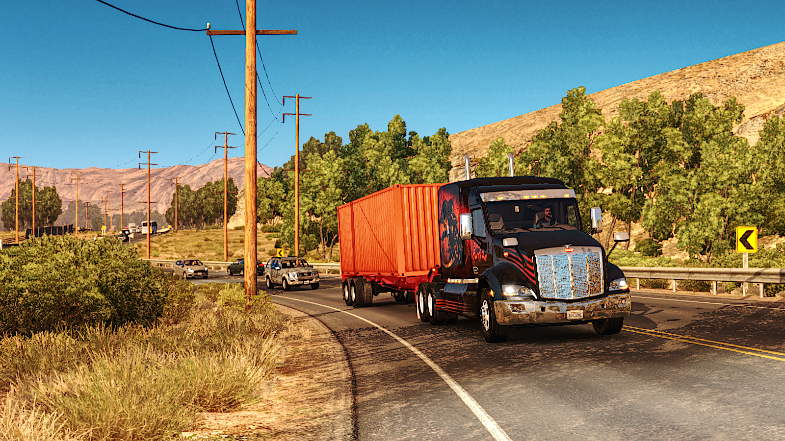 …in a suitably Halloween Themed trailer – looks like one of our customers got into the spirit too 🙂 Probably the most fun run of the day as we had some real excitement as we blasted through Barstow. A car came off the slip road in front of us doing, I guess, 20mph! It looked like I was out of options – emergency braking would not prevent a collision and there was a car alongside in the fast lane. Split second decision – I cut onto the end of the slip road behind him and passed him on the right taking a little bit of the grass before gaining the hard shoulder and then cutting back into the lane in front of him! I somehow contrived to miss a telegraph pole and the Armco barrier. I didn’t touch the ai either and I swear that when I looked in the mirror that ai had a totally bemused look on its grill 😉
