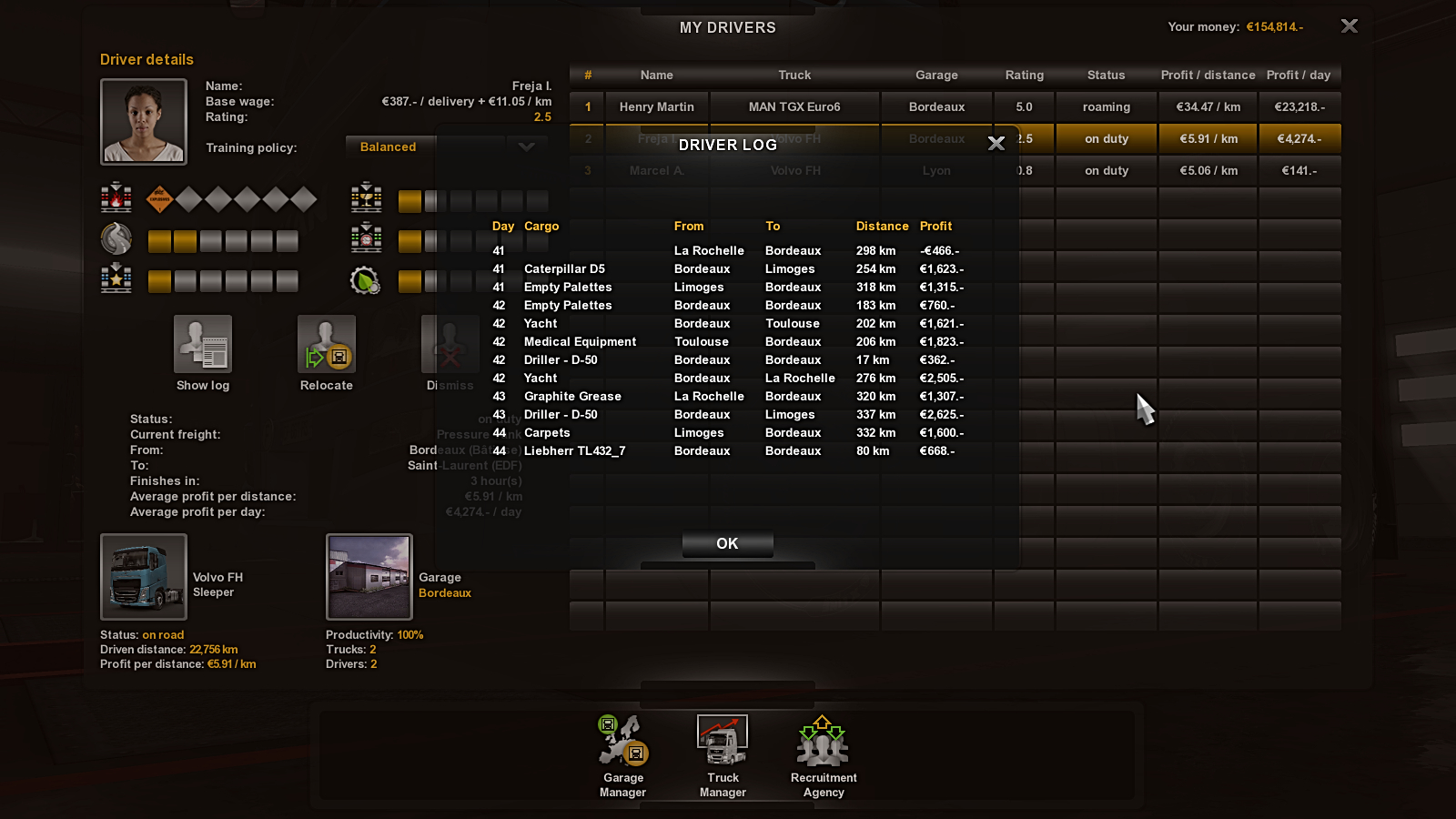 You can see from the screen shot that she has been doing lots of trips in western France shifting a variety of cargoes and adding to her skill set as she goes. She’s now making the company a daily profit of €4K after her wages have been paid. And that’s what having employees does for your bottom line in this game!