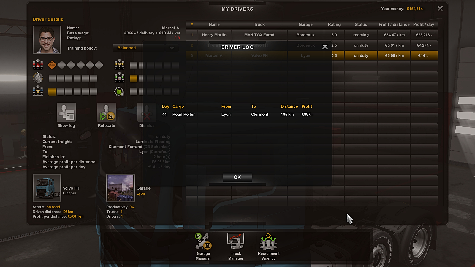So there we are – two employees and lots of cash coming in. I’ll be in a position to purchase another garage very soon. I have my eye on Montpellier as the likely choice. That will give us a triangle of depots in the Southern area of France. Then perhaps a Garage in Paris to make it a diamond of depots? I’ll continue driving the TGX for the time being as we build up the basic Volvo fleet and I’ll take another look at the Renault Range T in my main profile to see if I can overcome the issues I experienced with it. Until next time… Happy Trucking 🙂