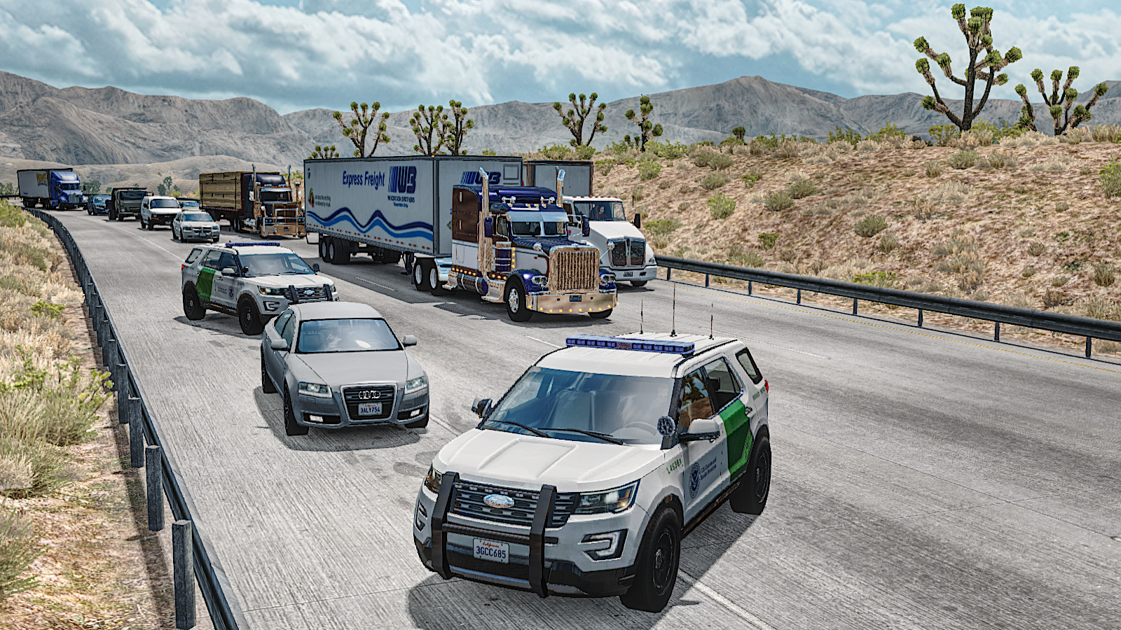 …She’s seen here drifting past one of the new Random Events on I15 on the way to San Diego from Las Vegas with a load of transmissions. Two Customs Cars and an Audi – gotta be a drugs bust?! We continued down the I15 and found that the intersection with the I10 has suddenly grown because I15 now goes all the way down to San Diego…