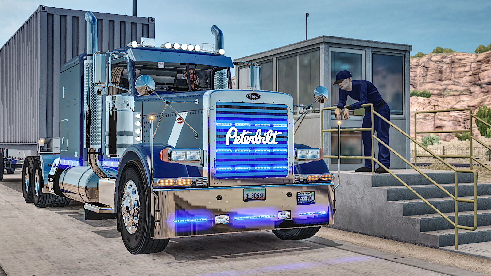 Phoenix offered the chance to buy our third truck for the Lone Star project. Once again this is a slightly older truck unlike my main profile where I will be driving current vehicles. We’ve replicated a 1995 Freightliner FLB with a Detroit Diesel Series 60 500HP engine. She’s got a 13 speed Eaton-Fuller gearbox and a retarder. The paint job is one produced by Lucasi while the truck is the work of Harven and represents the latest iteration in a long history of this mod by a variety of authors over the years. Here she is climbing out of Phoenix with a load of Dried Milk for Alamogordo…