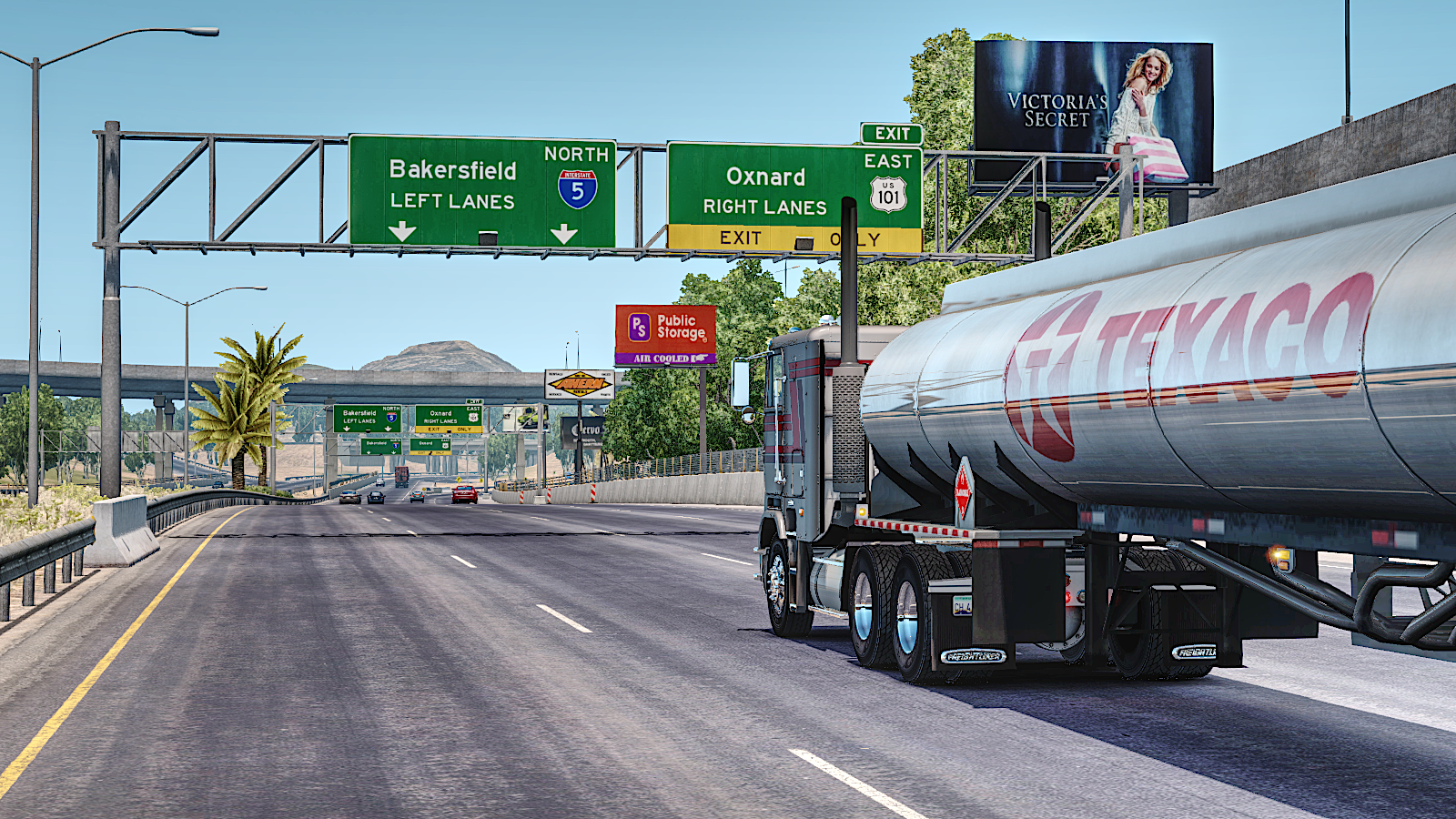 Passing through Los Angeles on I5 with a load of Petrol bound for Fresno. This looks like the real world Route 170 / 101 intersection in West Toluca Lake – SCS often mix and match roads and junctions to fit the 1:20 scaling of the map and they do tend to go with the more interesting junctions 🙂