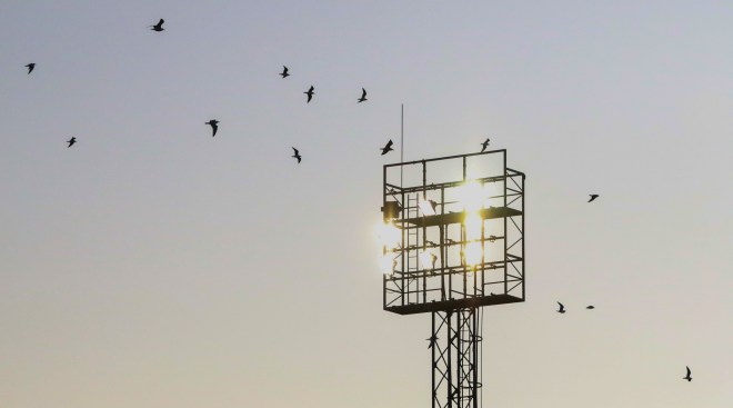Nightfall 1 – Gulls fly past The floodlights of Imber Court on their way to roosts at Kempton Park Waterworks and along the Thames…