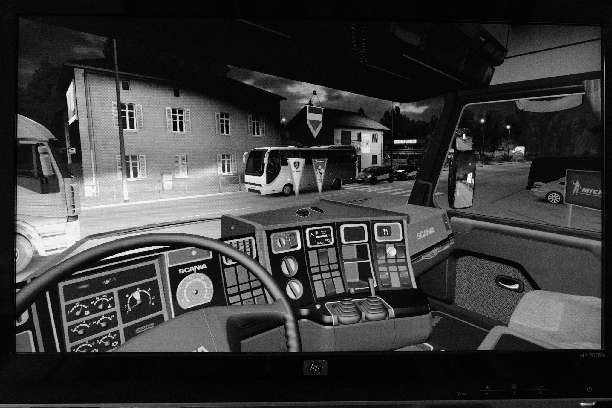 A shot of the screen rather than a screenshot 😉 I was waiting to turn left in Bourges and as I was stationary it seemed like a good time to use the camera. I am, of course, doing an early morning drive in Euro Truck Simulator 2. I’m in a Scania 113M and we’re taking a load of Aircraft Tyres from the Michelin factory to Nantes Atlantique Airport. Taken with the Fujifilm X-Pro2 using its internal ACROS Black and White setting. 1/70th at f5.6 iso6400.