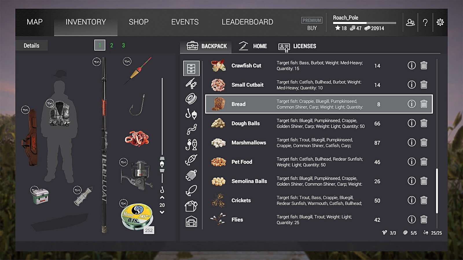 Everyone starts with a Telefloat rod, number 8 hooks, 2lb line, a float and some basic baits (Bread, Red Worms and Cheese – ignore the others in the screenshot, you get access to them as you level up) Here’s my current inventory screen with the Telefloat rod…