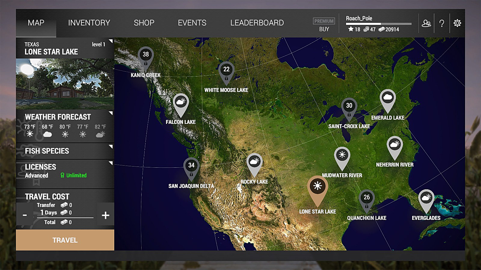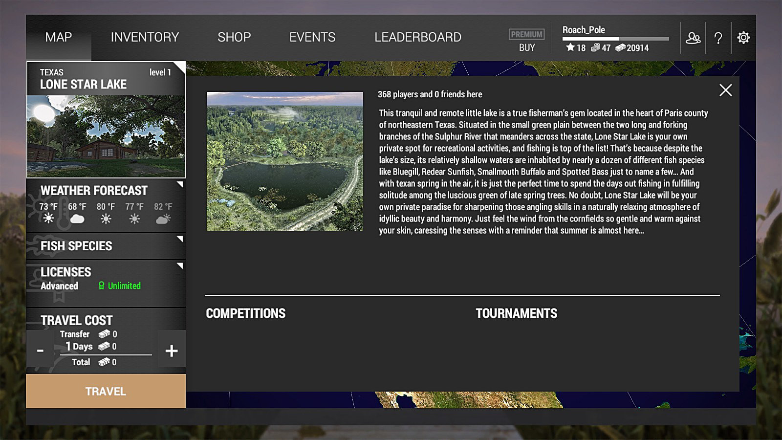 …several of them are unlocked because in the 10 days that I’ve been trying out this game I have risen to level 18. Currently everyone starts at Lone Star Lake in Texas – highlighted in brown above. Every venue has an info screen like this one…