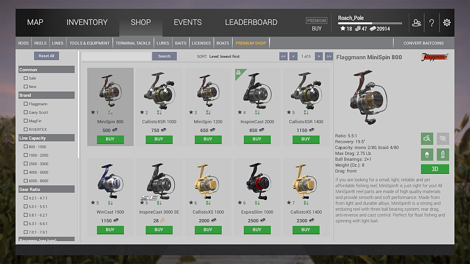 …You can see that most of the reels can be bought with credits but one of the ones on screen requires you to spend gold – this is true of certain items and baits in the shop. choose wisely where to spend your gold!