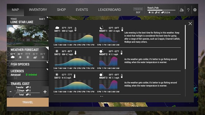 …And from the side menu you can check out things like what fish species are present, what the weather is like and how that will affect the fishing…